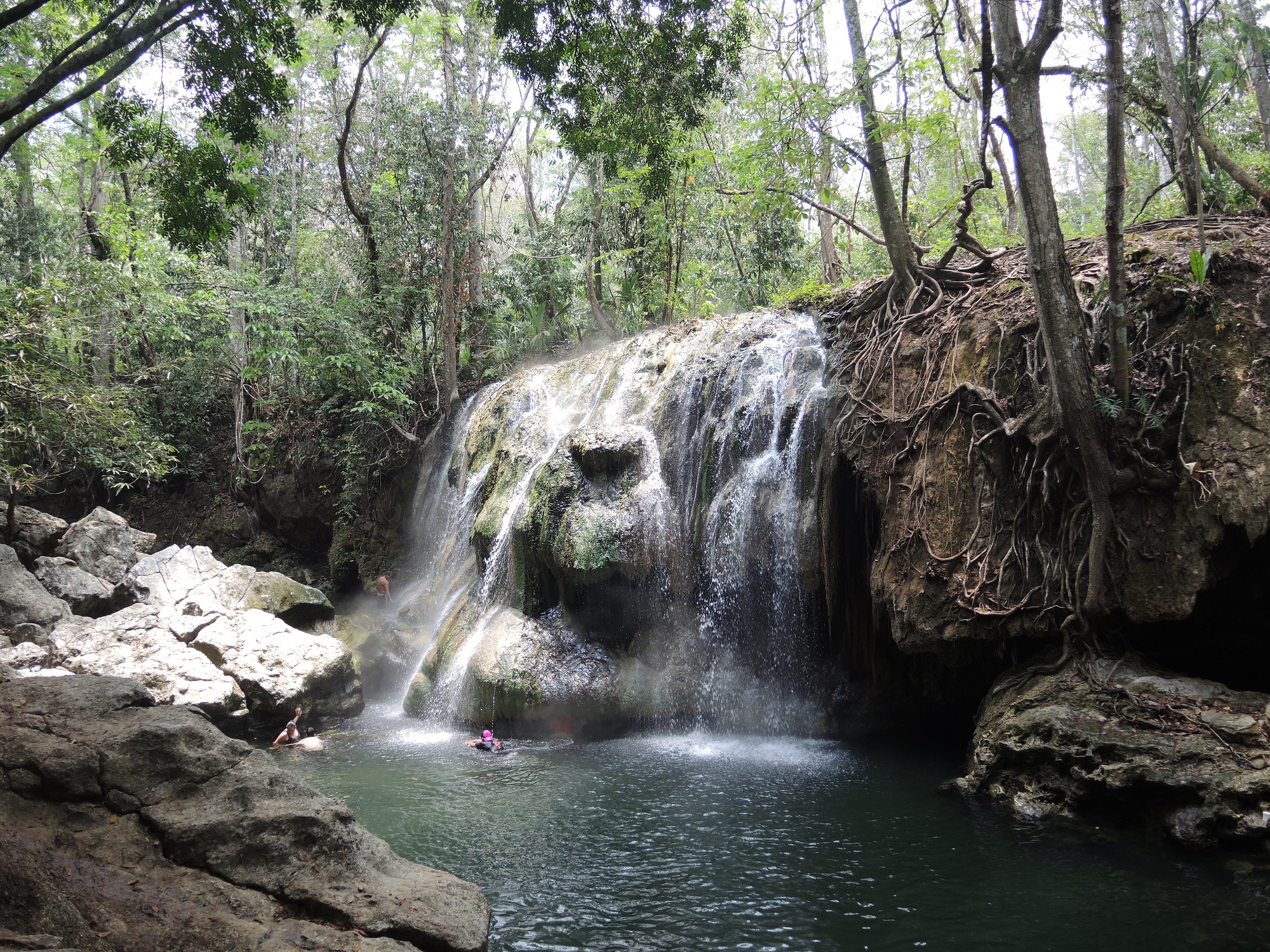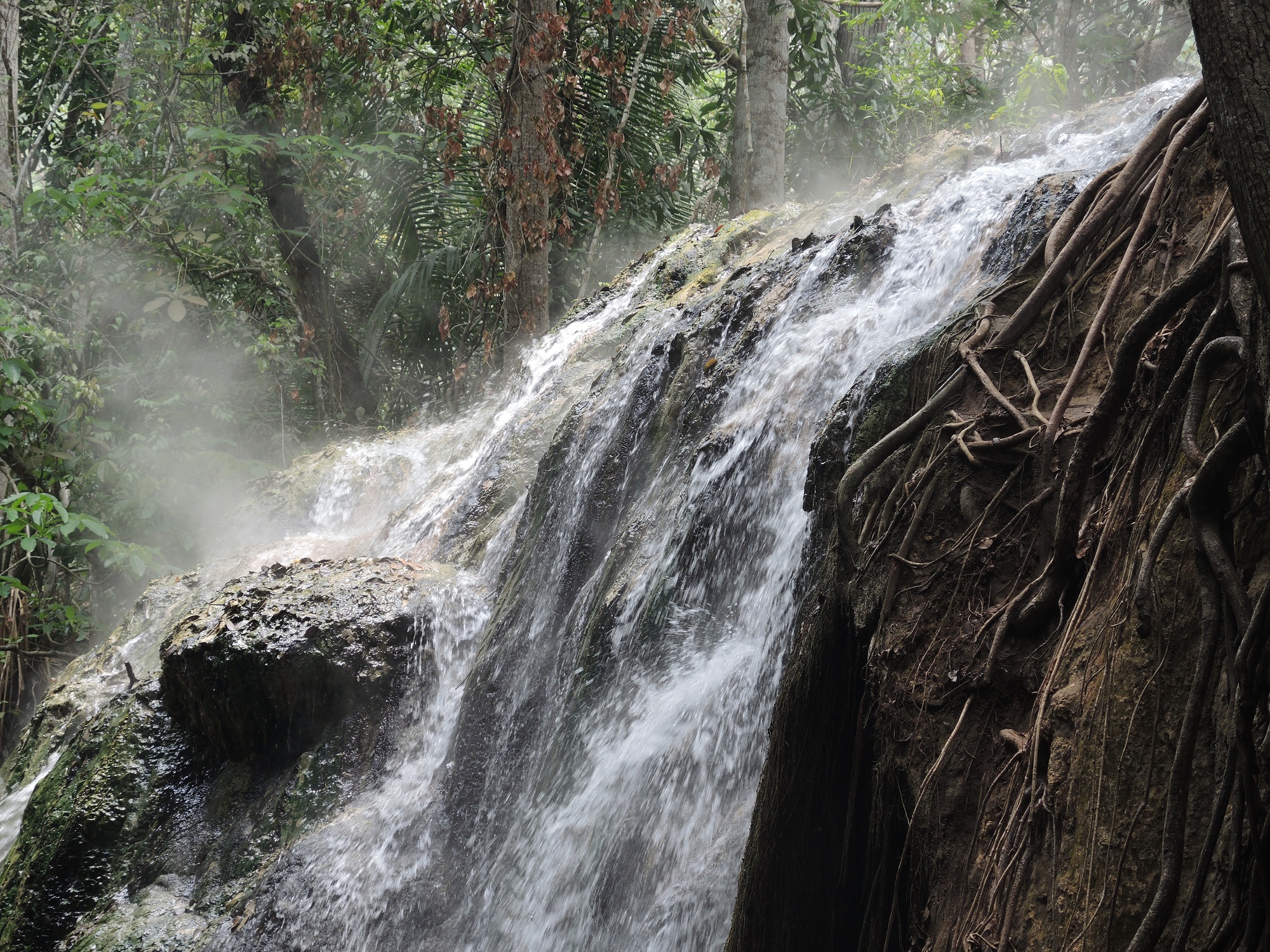 Später am Tag geht es zu einem nahegelegenen heißen Wasserfall. Auf unserem Weg dorthin beobachten wir ein paar einheimische Frauen, die am Fluss ihre Wäsche waschen. Natürlich tragen sie ihre Babys auf dem Rücken in ein Tuch gebunden bei sich. Eins schreit wie wild. Ich bin mir nicht sicher, ob das für die Babys so lustig ist .. Nach einem kurzen Fußmarsch auf einem Waldpfad kommen wir dem Geschreie und Gelächter immer näher. Vor uns mitten im Wald ein Wasserfall vielleicht 15 Meter hoch und davor ein Becken. In dem Becken an die 40 Einheimische beim Planschen. Was für ein Spaß!