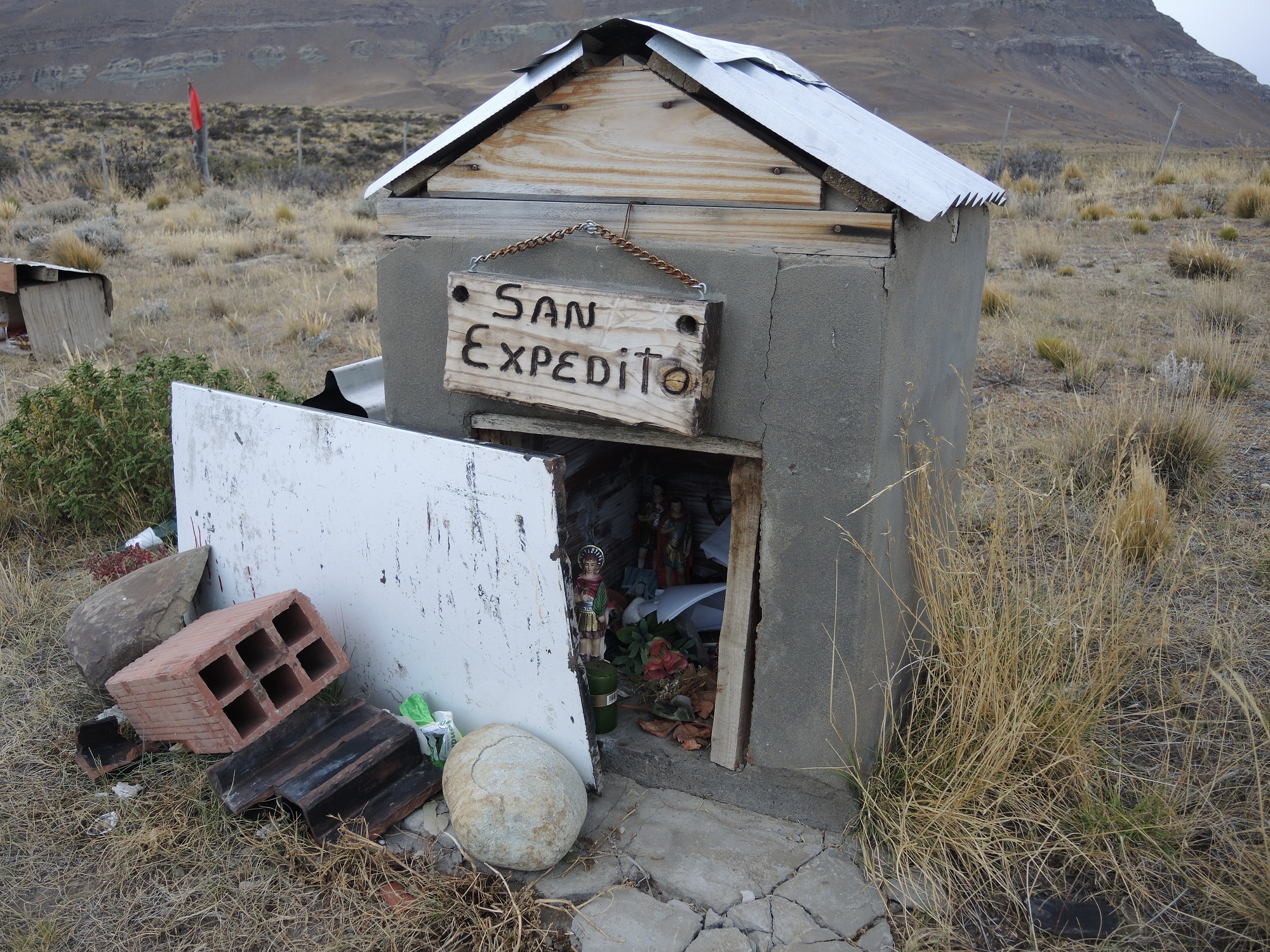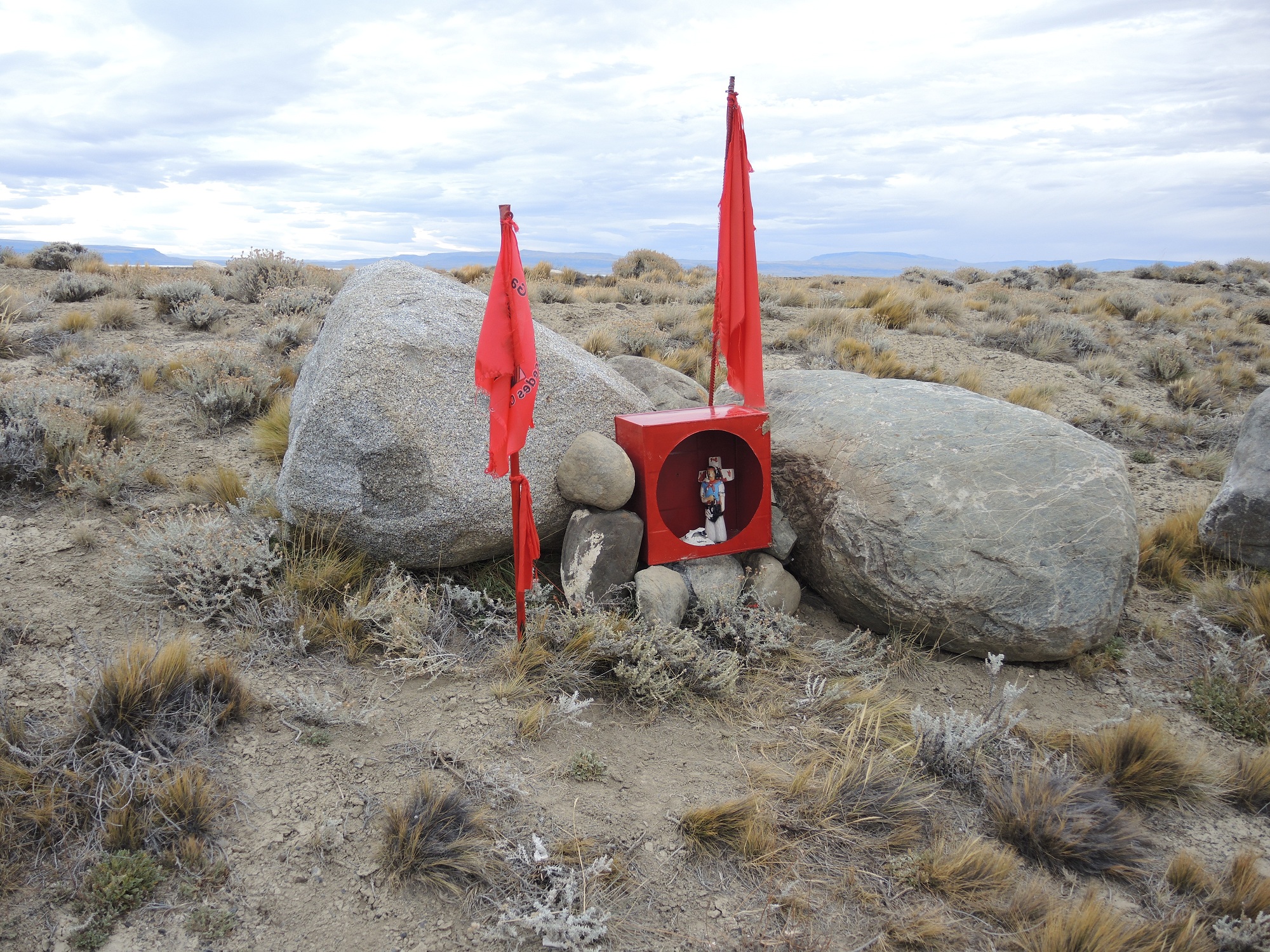 Auf dem Rückweg halten wir am Straßenrad bei ein paar roten Waschmaschinen, die uns schon auf dem Hinweg aufgefallen sind. Wieder eine Begegnung mit Argentiniens Schutzheiligen. Uns sind bisher 4 davon begegnet – es scheint aber noch mehr zu geben. Das wollen wir euch nicht vorenthalten, da die Straßenränder hier teilweise regelrecht überflutet sind mit Schreinen für die Schutzheiligen: