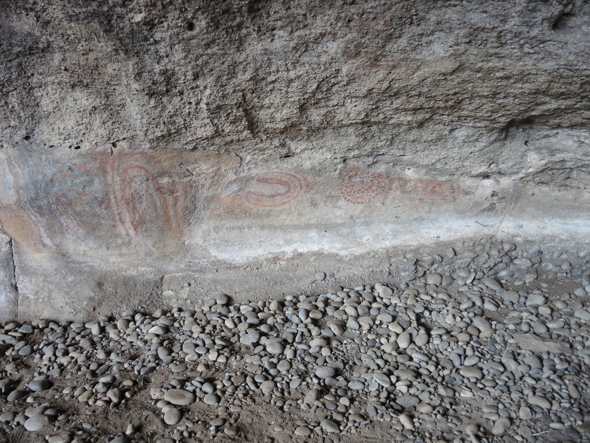 Die Höhlen sind nicht besonders groß, aber interessant. Die Tehuelche – eine Gruppe von Ureinwohnern Feuerlands – haben hier Wandmalereien hinterlassen. An den Höhlen und an den Steinhäufen. Drum herum sieht man sehr eindrucksvoll, dass hier überall Meer war. Die Felsen sind Stück für Stück vom Wasser geformt. Alles sieht aus wie Schweizer Käse mit Querstreifen.