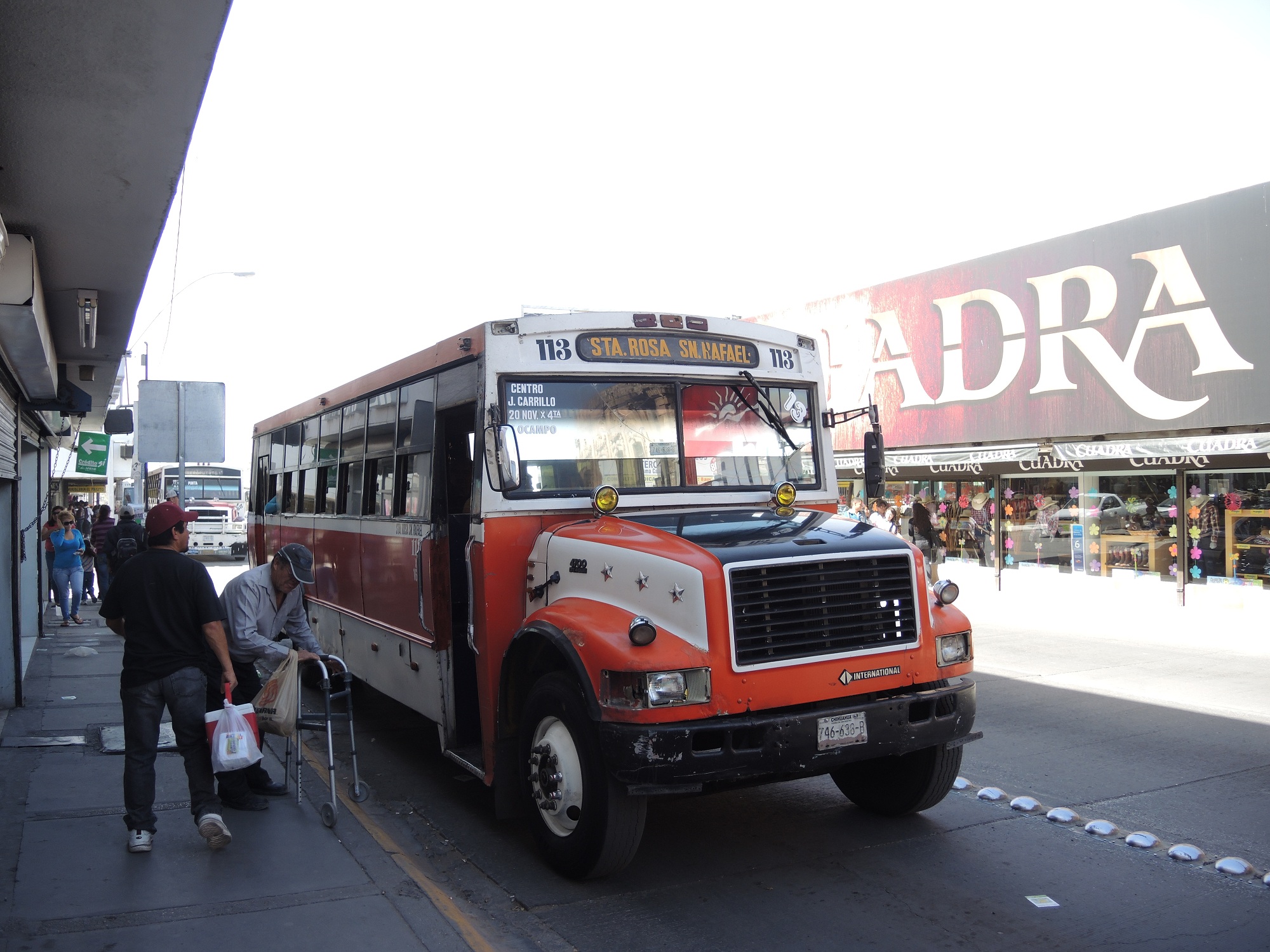 Unser erstes Ziel im neuen Land: „Chihuahua“. Dieses Wort können wir bis zum Flughafen nicht wirklich aussprechen. Nach einer längeren Diskussion am Flughafen, weil wir keinen Ausreise- Flug haben, meint die nette Dame aber .. Chihuahua – wie der Hund. Ist doch ganz einfach 🙂 Tatsächlich muss man anscheinend ein Weiterflugticket nachweisen, wenn man in Mexiko einreisen will. Leider haben wir das nicht. Leider haben wir auch kein Busticket, welches uns ins nächste Land führt und wissen auch kein Ausreisedatum .. wir wissen auch nicht wo wir nächste Woche sein werden, wir wissen ja noch nicht einmal wo wir in dieser Nacht schlafen. Wir sind Weltenbummler ohne Plan. Hmm .. Ratlosigkeit auf der anderen Seite des Schalters. Sie telefoniert, tippt wild auf ihrer Tastatur herum, fragt die Kollegin nebenan .. Von all dem verstehen wir natürlich kein Wort. Schließlich wendet sich wieder an uns mit der Frage „aber ihr wollt wieder ausreisen?!?“ nachdem wir gleichzeitig mit „JA“ antworten, bekommen wir den entscheidenden Stempel in unseren Pass. Ein schöner Stempel in den Nationalfarben grün und rot. Wir sind drin.