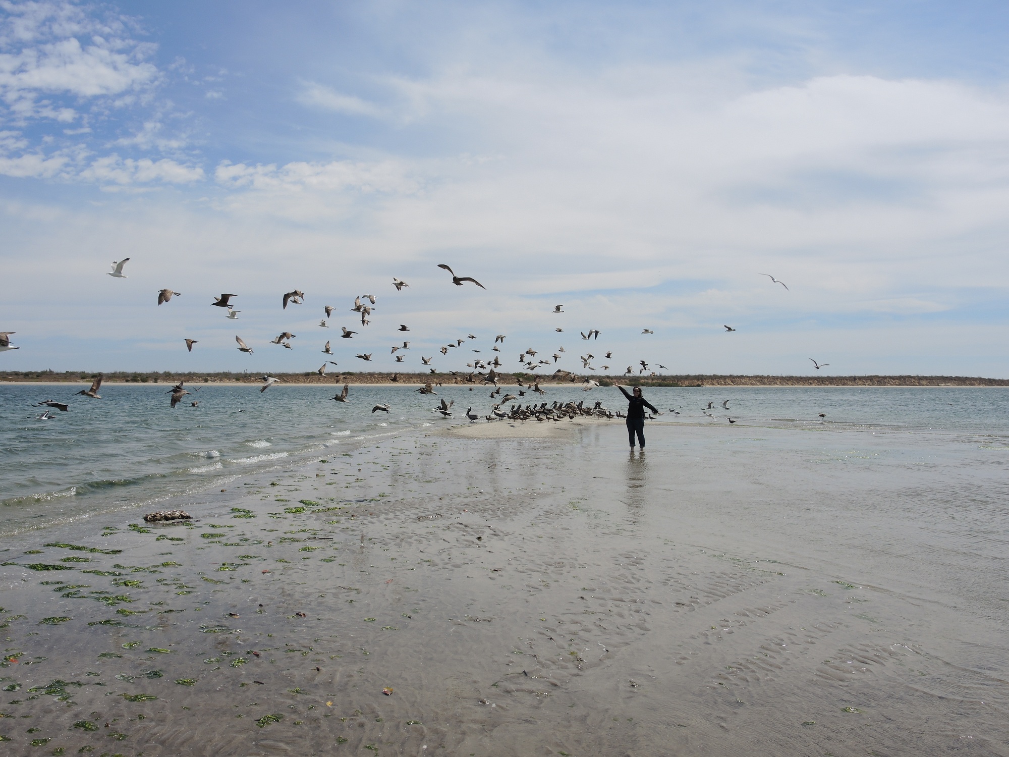 Mit einem einheimischen Fischer und einem Boot geht es hinaus auf den Pazifik. Ca. eine Stunde fahren wir bei voller Fahrt Richtung offenes Meer. Dennoch befinden wir uns geschützt in einer Bucht von der Isla Santa Margarita umgeben. Ein ideales Gebiet für Grauwale.